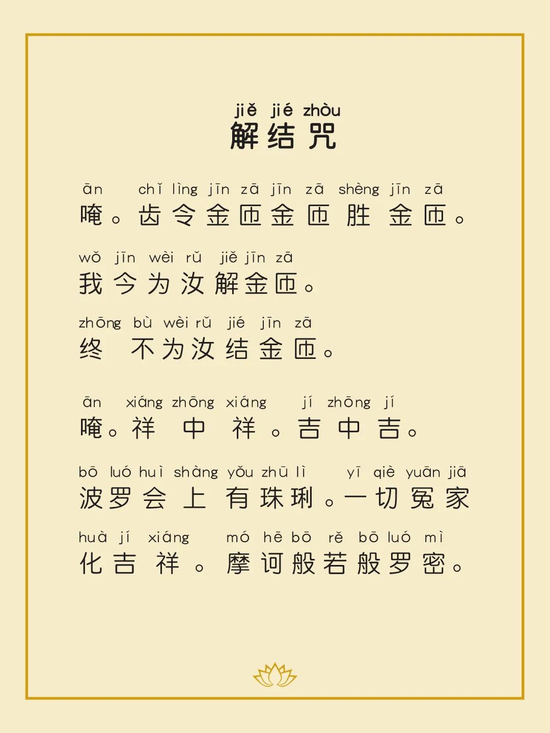 念《解结咒》之前可以祈求:“请大慈大悲观世音菩薩保佑我XXX(您的名字)与YYY(可以是您亲人的名字或朋友的名字或同事的名字),化解恶缘”。
